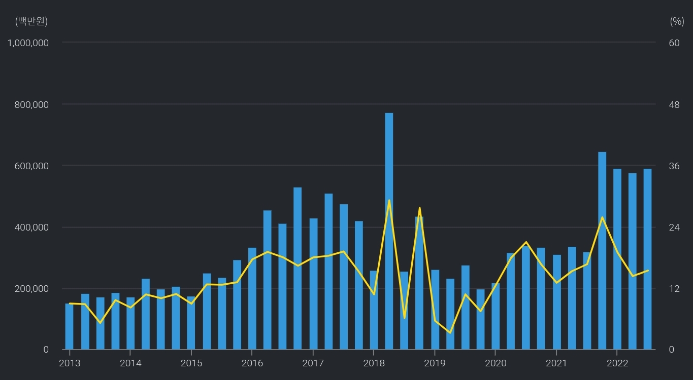 매출액(파란색) 증가 + 영업이익률 상승 중 : 영업이익률 건설사 중 보기드물게 10% 대 중반