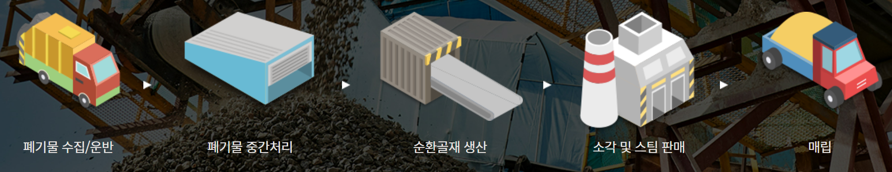 우선, 건설폐기물들을 주워옵니다(폐기물 수집.운반). 중간에 낀 다른 물질 같은 것도 걸러내야겠죠(중간처리). 그리고 앞서서 콘크리트사업도 아이에스동서가 하고 있다고 말씀드렸죠. PHC파일 같은 콘크리트를 만들려면 시멘트, 철근도 필요하지만 골재도 필요하죠. 이 골재를 다시 리사이클링해 재생산을 하여 다시 씁니다(순환골재 생산). 이 과정이 끝나며 그래도 남는 이물질이 있겠죠. 소각을 해야할텐데요. 이 소각하는 과정에서 열이 발생하겠죠. 이 열로 터빈을 돌려 에너지를 생산을 하게됩니다(소각 및 스팀판매). 그리고, 최종쓰레기를 매립하는 과정이면 끝이나는 것이죠.