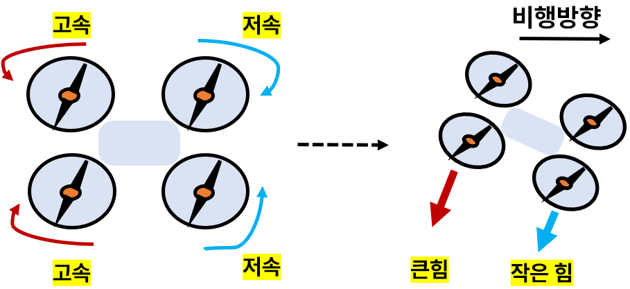 추력으로 드론을 앞으로 미는 원리는 간단해요. 나아가고자 하는 방향쪽에 있는 '앞쪽 프로펠러2개'의 회전력을 낮춥니다. 그러면, 전방은 압력이 떨어진 상태가 되겠죠. 반대로, 꼬리부분인 '뒷쪽 프로펠러2개'의 회전력을 높이면 바람의 세기가 강해지면서 상대적으로 '고압'이 되겠죠. 앞서 배웠듯이, 바람의 이동방향은 '고압(뒷쪽) > 저압(앞쪽)'이기 때문에 드론을 미는 추력이 생기게 되는 것이죠.