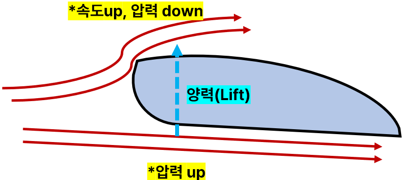 양력의 원리는 간단해요. 압력의 차이로 물체를 띄우는데요. 바람의 이동은 '고압 to 저압'으로 이동을 하죠. 그러면, 물체를 띄우기 위해서는 아래 쪽이 고압, 위쪽이 저압이면 됩니다. 아래에서 위로 바람이 이동하니깐요. 그래서, 프로펠러의 상단 부분을 굴곡지게 만듭니다. 바람이 부딪혀 압력이 떨어지게 하는 것이죠. 반대로, 프로펠러 하단 부분은 평평하게 만들어 공기의 흐름이 무난하게 지나간다면, 상대적으로 아래쪽 압력이 커지게 됩니다. 이때, 위아래 압력차이로 인한 '양력'이 생기게 되는 것이죠.