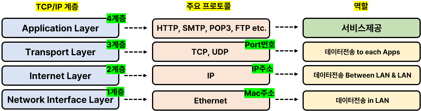 * TCP/IP 주소 : 전송계층(Port번호), 인터넷계층(IP주소), 네트워크 인터페이스계층(MAC주소)