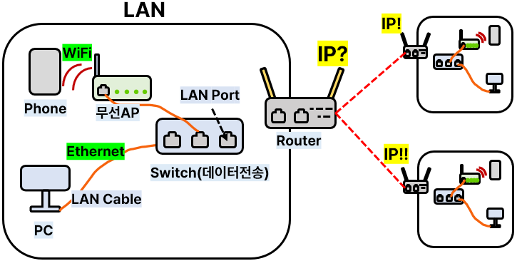 또 다른 예시는 LAN과 LAN끼리 통신하는 것이에요. WAN(Wide Area Network)라고 배웠죠. 이때, 사용되는 네트워크장비인 라우터(Router)도 하나의 규칙을 따르고 있어요. 그 규칙이 바로 'IP(Internet Protocol)'입니다.