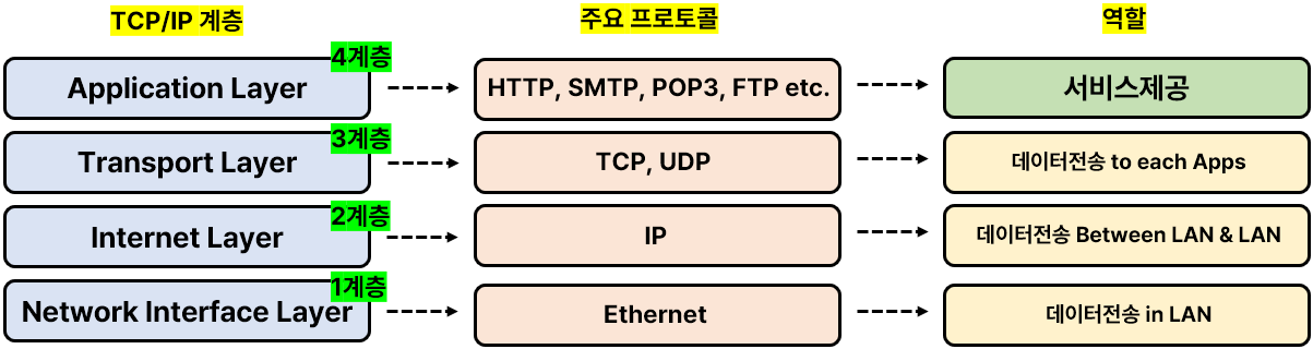 TCP/IP 프로토콜 모델은 총 4개의 계층이 있습니다. 1층부터 '네트워크 인터페이스계층, 인터넷계층, 전송계층, 앱계층'이 있어요. 각기 계층은 이름도 다르듯 하는 역할도 다른데요. 다만, 목적으로 구분을 2가지로 나눌 수 있어요. 홈페이지, 이메일 같이 서비스를 목적으로 하는 것은 4계층인 앱계층(응용계층)이에요. 그리고, 1,2,3계층들은 '데이터전송'이 목적이죠. 예를 들면, 2계층인 인터넷계층의 프로토콜은 'IP'이죠. IP는 LAN끼리 데이터를 전송하기 위해서 쓰이는 프로토콜인 것입니다.