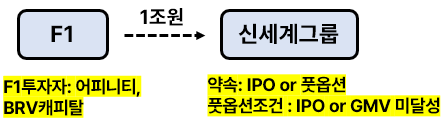 - 문제발달 : 사모펀드(어피니티, BRV캐피탈) 1조원투자 for 신세계그룹 > 투자이유 : 풋옵션(Put option)+IPO추진 > 문제점 : 신세계그룹 풋옵션딜 의무x(이유: GMV 매출액 달성)