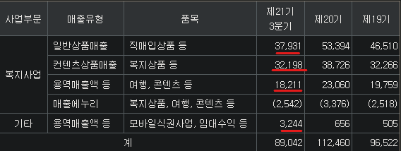 직매입상품(43%), 컨텐츠상품(33%, 복지상품=여행상품 등), 용역(20%, 컨설팅), 기타(4%, 모바일식권, 임대수익 등) / 모회사 : 현대지에프홀딩스 / 자회사 : 벤디스(모바일식권) / 경쟁력 : MS 50% /