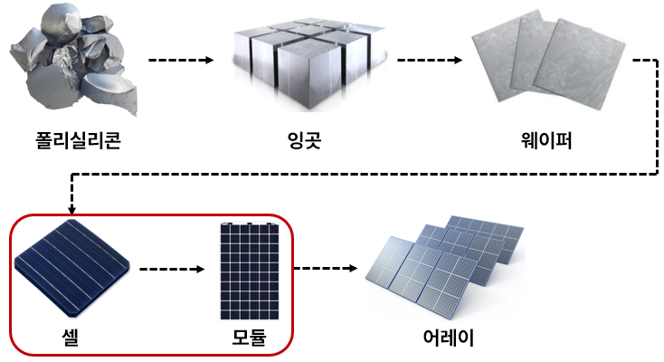 HD에너지솔루션은 태양광 셀&모듈업체에요. 셀&모듈 업체를 보통 미드스트림이라고 부르는데요. 태양광의 생산공정을 보면, 더 이해하기 쉽습니다. 아래 그림을 보면, 태양광용 폴리실리콘이 원재료에요. 이를 갖고 잉곳 > 웨이퍼로 만들죠. 그리고, 웨이퍼 위에 패터닝(회로 생성)을 하면, '셀'이 되는 것이죠. 이 셀들을 목적규격에 맞게 여러 개로 으면, '모듈'이 됩니다. 참고로, 어레이(Array)는 모듈들을 여러 개 모은 것을 의미해요.