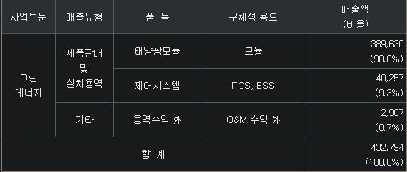 태양광모듈(90%), 제어시스템(9%, 인버터, ESS), 기타(1%, 용역) / 생산지역 : 국내