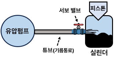 * 원리 : 유압펌프(액체 밀어냄)-유압튜브(액체이동)-유압실린더(피스톤 움직임)-제어밸브(액체흐름조절&피스톤속도제어)