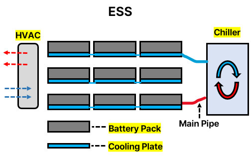 - ESS 수랭식 부품 : Chiller(유체 냉각 for 냉각수 방출), Cooling Plate(냉각수 지나가는 길 for 냉각 onto 각 셀), HVAC(공조장치) , Bus-Bar(전류 전달&제어)