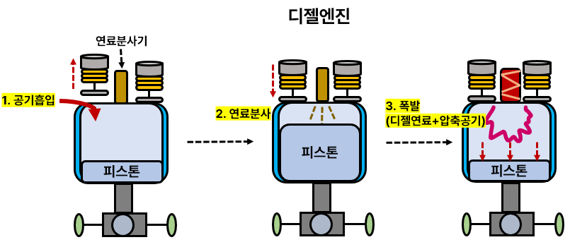 디젤엔진 : 뜨거운 공기(55~65°C) + 연료분사기 for 피스톤 왕복운동