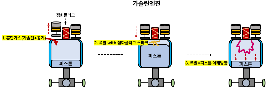 엔진에서 가솔린엔진의 동력은 매우 간단해요. 우선, 혼합가스(ex- 가솔린+공기)가 흡입밸브를 통해 연소가 일어나는 곳인 '실린더(Cylinder)'로 들어갑니다. 그리고, 피스톤(Piston)이 혼합가스를 아래에서 위로 압력을 가합니다. 혼합가스가 압축이 되겠죠. 이때, 압축된 혼합가스가 '점화플러그'와 만나면 스파크가 발생하면서 '폭발'이 일어납니다. 이 폭발력(화학에너지)으로 피스톤을 다시 아래로 밀어내면서 바퀴를 굴리는(운동에너지) 것이죠.