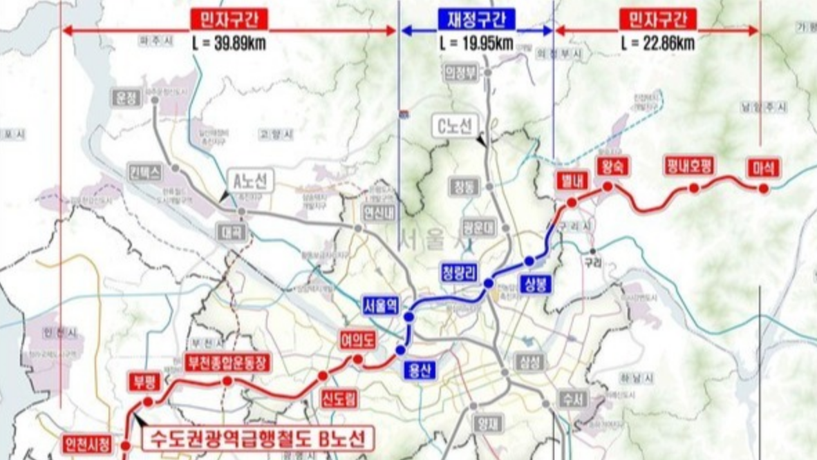 GTX-B노선은 민자구간-재정구간-민자구간으로 나뉘어지는데요. 민자구간에 주목하면 됩니다.
