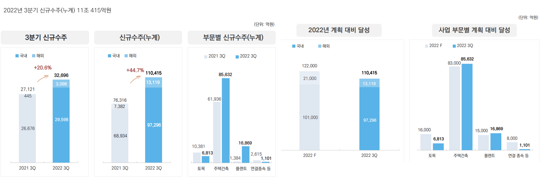 신규 수주의 경우도 전년도대비 20.6% 증가하였으며, 2022년의 계획대비 달성률은 90.5%이다.
