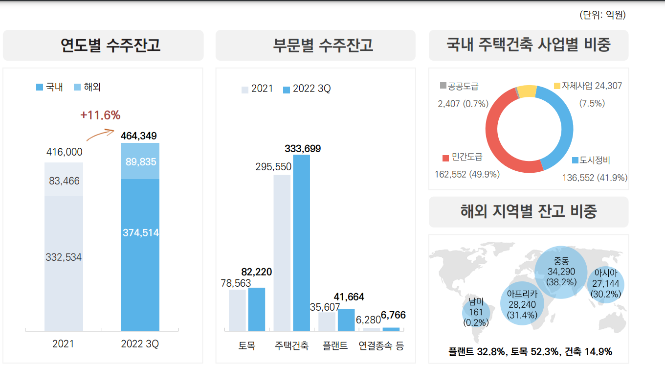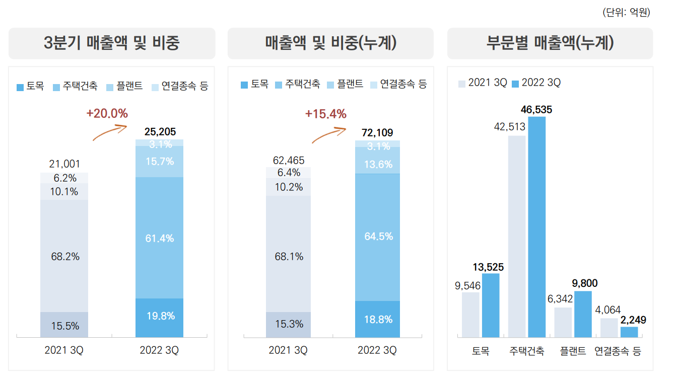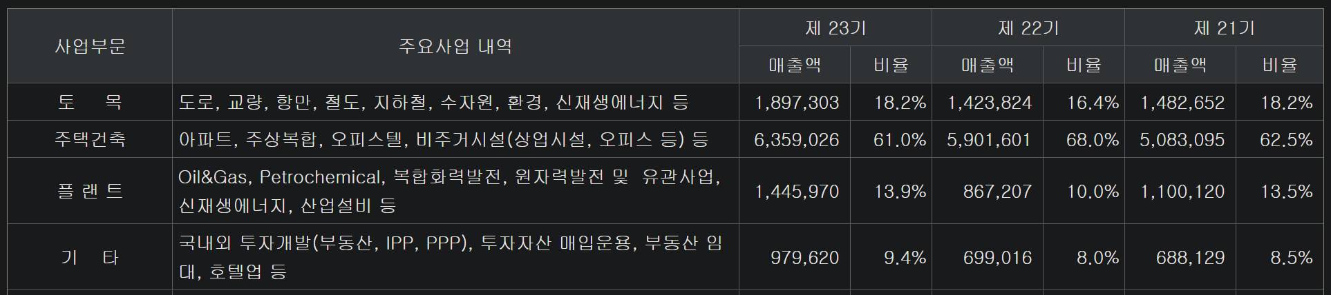 국내 주택의 비중이 높아져 너무 의존적이지 않나 생각이 들었는데 전체 매출증가와 토목과,플랜트 사업의 비중 증가는 좀 더 안정적인 느낌을 주며