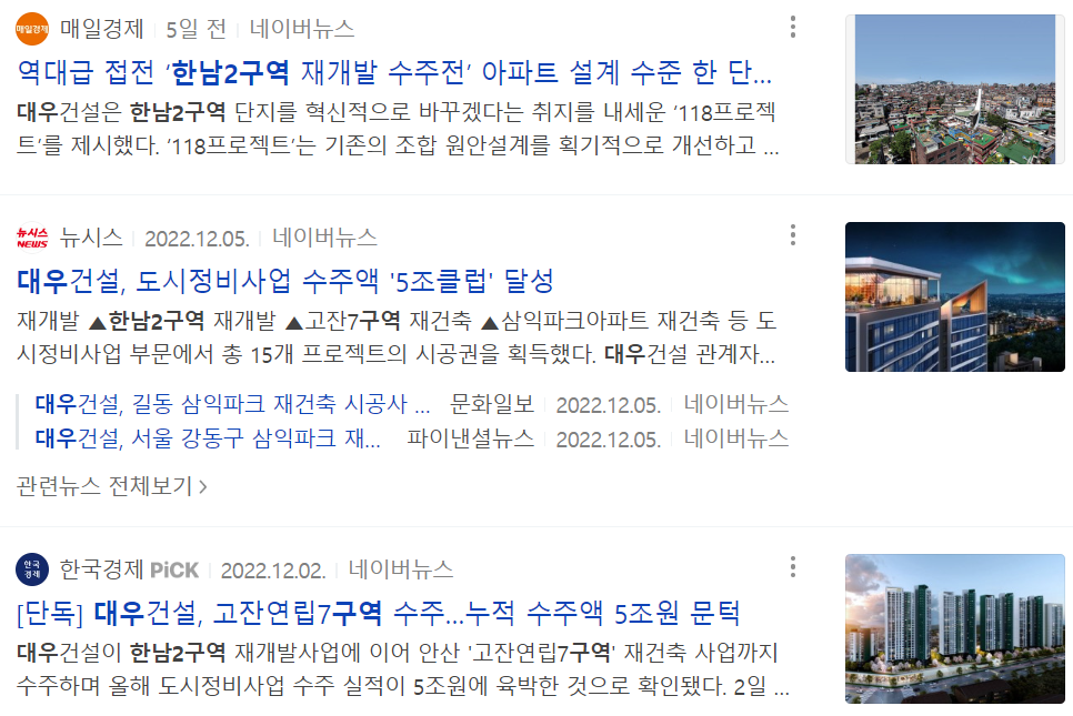 최근의 이슈를 살펴보면 총 공사비만 7900억원인 부촌의 랜드마크 '한남 2구역'롯데와의 수주 경쟁에서 이겨(왜 삼성물산과 현대는 왜 발 뺏을까? 사업성이 없어서? ) 처음으로 도시 정비사업 수주액 5조를 돌파하였으며