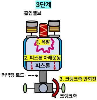 3단계 엔진작동순서 : 혼합가스 압축(by 피스톤 위운동) > 폭발(점화플러그+압축혼합가스) > 피스톤 아래운동 > 커넥팅 로드 직선아래운동 > 크랭크축 반바퀴