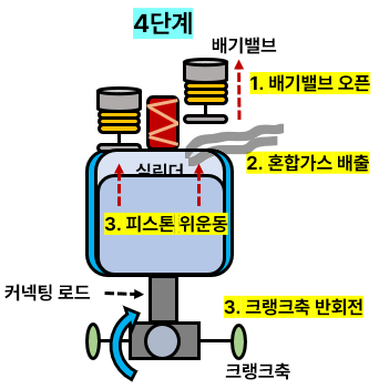 4단계 엔진작동순서 : 혼합가스 배출(배기밸브 오픈) > 피스톤 위운동(압력차이) > 커넥팅 로드 직선위운동 > 크랭크축 반회전