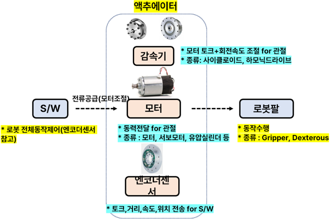 - 액추에이터(Actuator) : 동력전달 for 관절 > 종류 : 모터(단순회전), 서보모터(제어+센서 for 정밀위치-속도제어), 유압실린더(유체기반)