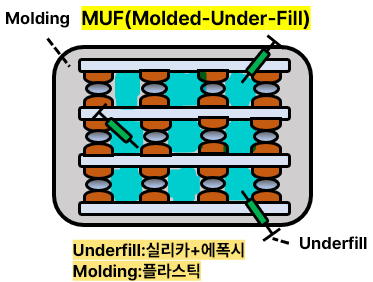 MR-MUF(Mass Reflow - Molded UnderFill) : Mass Reflow(범프 납땜 in 오븐), MUF(플라스틱 몰딩 + 액체형 에폭시&실리카 언더필)