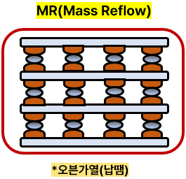 MR-MUF는 Mass Reflow - Molded UnderFill의 약자에요. 이름 그대로, Mass Reflow는 많은 양(Mass)의 범프들을 리플로우(열을 가하여 납땜)하는 것이에요. TC-NCF 방식이 NCF라는 필름으로 범프, 웨이퍼 모두를 채우려고 했다면, MR-MUF는 우선 범프들의 납땜을 먼저 하는 것이죠. 이때, 오븐에 한 번에 구워버립니다. 이것이 MR(Mass Reflow) 과정이에요.