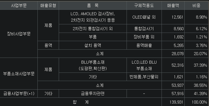 디스플레이 검사장비(12%, AOI for LCD, OLED), BLU부품(39%, 도광판, 확산판 for LED광원 to 평면광), 이차전지외관검사장비(8%), 금융투자(41%) / 거래처 : SDC / R&D : Rapair 장비(Laser, Metal, PI, PCB) / 자회사 : HB반도체세컨더리투자조합(금융투자)