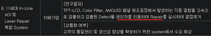 동사는 검사장비와 BLU 부품인 도광판, 확산판을 만들고 있죠. 다만, 검사장비도 OLED, 이차전지에서만 성장성이 나오고 있고, LCD향 BLU부품, 검사장비는 거래처인 삼성디스플레이가 점차 사업을 접고 있는 분야 중 하나입니다. 그래서, 동사의 핵심 과제는 사업 다각화 인데요. 아래 R&D 내역을 보면, 레이저를 이용하여 Repair(수리)하는 연구개발을 진행한 것을 알 수가 있어요. Laser Repair장비가 검사 이후 불량이 발생하면, 수리를 해주어서 수율을 높여주는 역할을 하는 것이죠. 다만, 아쉬운점은 디스플레이향으로만 되어있죠. 이것이 반도체 기판으로 넘어간다면, 성장성이 높은 반도체산업으로부터의 수혜도 기대됩니다.