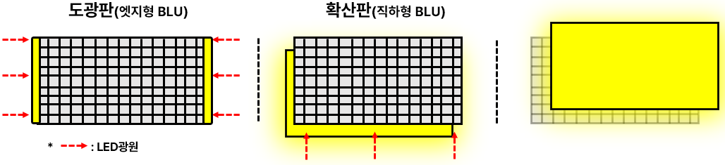 BLU도 빛을 내기 위해서는 광원이 들어와야겠죠.즉, 광원(주로 LED)을 들여와 BLU에 골고루 분산시키는 부품들이 필요해요. 이들을 도광판(Light Guide Plate), 확산판(Light Diffuser Plate)입니다. 이 둘의 구별은 어느 방향에서 광원을 들여오는지에 따라 구분해요.