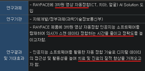 레이의 핵심은 '소프트웨어'에요. 사람을 사진(2D)으로 볼 때보다, 실제로(3D) 볼 때가 더 정확히 볼 수 있는 것 처럼 구강스캔을 통해 3차원 데이터로 표현하는 것이 레이의 경쟁력입니다. 레이의 H/W, S/W를 사용하는 의사입장에서도 빠르고 정확한 판단을 할 수 있기 때문에 치료 효율이 높아지는 효과가 생기겠죠.