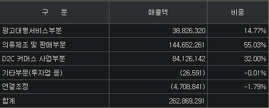 의류 제조&판매(55%, 안다르=애슬레저), 이커머스(32%, 마사지기기, 매트리스, 화장품 등), 광고대행업(13%) / 경쟁력 : 직접투자