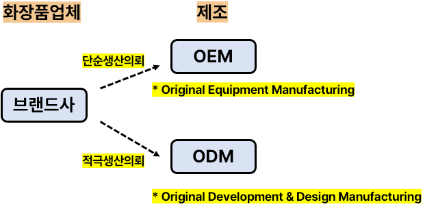 1. 화장품 OEM / ODM : 처음부터(Original) 개발(Development)+디자인(Design)하여 생산(Manufacturing) for 브랜드