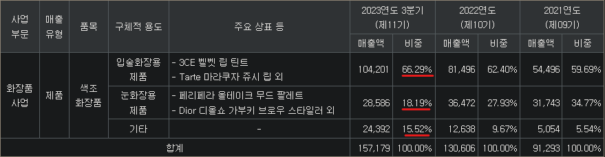 화장품ODM(84%, 색조화장품= 입술8, 눈2), 기타(16%) / 생산지역 : 국내, 중국