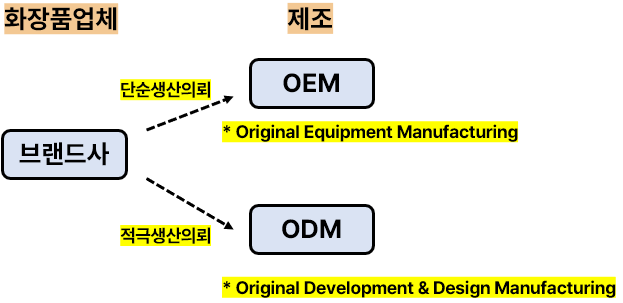 1. 화장품 OEM / ODM : 처음부터(Original) 개발(Development)+디자인(Design)하여 생산(Manufacturing) for 브랜드