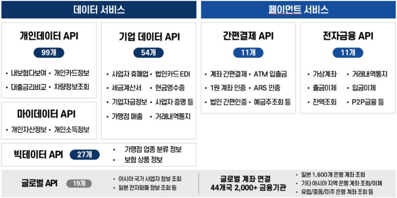 페이먼트 서비스 : 간편결제 API(간편결제, 비대면인증=1원계좌인증, ARS인증, 제로페이 등), 전자금융API((입금이체=급여, 출금이체=요급수납, 가상계좌=공과금,카드대금)