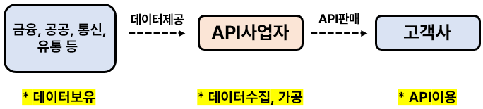 데이터 서비스(API, Application Programmable Interface) : 데이터 수집-가공-판매(라이센스, 정액제, 종량제) > 종류 : API(개인정보, 마이데이터, 기업정보, 글로벌, 제휴) > 거래처 : B2B