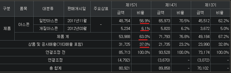 아스콘(63%, 아스팔트+콘크리트 for 도로포장, 주차장), 시공(37%) / 경쟁력 : 슬래그첨가 아스콘(천연골재 대체)