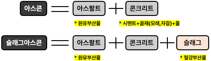 1. 아스콘(Ascon, Asphalt+Concrete) : 아스팔트(경제성,방수성) + 콘크리트(내구성,평탄성,방음성) for 도로포장, 주차장