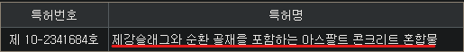 SG를 앞으로 지켜봐야하는 이유 중 하나는 바로 기존 아스콘생산방식에 슬래그를 추가하면서 비용절감, 친환경, 효율성 증대를 일으켰다는 것이에요. 슬래그(Slag)는 제강공정에서 나오는 부산물로 폐기물 처리되거나 다시 철강을 만드는데 사용되고는 했는데요. 기존 아스콘의 재료로 사용하던 천연골재(자갈, 모래)를 70% 이상 대체할 것으로 기대돼요. 폐기물을 사용하니 비용도 절감되고 내구성도 1.5배 높습니다. 화물차량 처럼 무거운 차량들이 다니는데 쓰이면 효율적이겠죠. 또한, 포장두께도 더 얇은데요. 기존 아스콘은 5cm 정도입니다. 반면, 슬래그 아스콘은 2.5cm로 절반 이상 두께가 줄어든 것을 알 수 있어요. 기술입증은 아래 특허번호를 확인하면 알 수 있어요.
