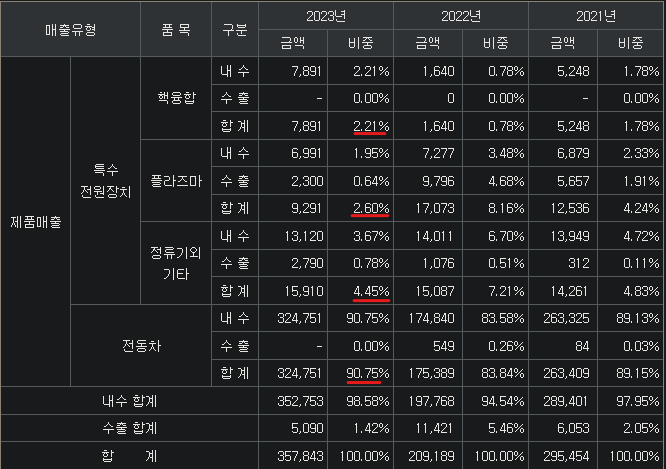 철도차량(91%, 전동차 for 철도), 핵융합전원장치(2%, 고주파전원장치 for 플라즈마, 자기장), 플라즈마전원장치(3%, 고주파전원 for 플라즈마 생성), 기타(4%)