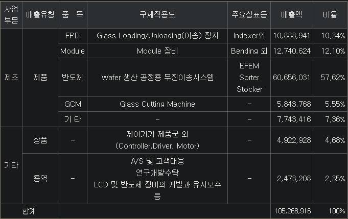 웨이퍼이송로봇(58%, 웨이퍼이송 in 대기중), 글래스이송로봇(10%, 글래스이송), 디스플레이장비(18%, Laser Cutter, Bending Machine=FPCB), 기타(14%, 부품, A/S) / 거래처 : 삼성전자, SK하이닉스, SDC, LGD, BOE