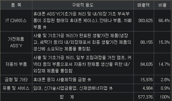 IT디바이스(66%, 스마트폰케이스, 서빙로봇, 전자담배 등), 가전제품 내외장재(15%, 케이스), 자동차부품(15%, 커넥터, LED램프), 기타(4%,금형, 투자) / 경쟁력 : 서빙로봇OEM / 거래처 : 삼성전자, 현대IHL(LED램프) / 생산지역 : 베트남(IT디바이스, 가전제품Ass'y), 중국(자동차부품)