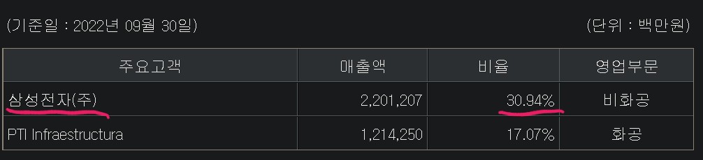 대한민국은 자원국가가 아닌데 왜 매출액이 높냐구요? 앞서 말씀드렸듯 비화공분야에서는 삼성그룹인 삼성전자, 삼성디스플레이, 삼성SDI, 삼성전기 등 공장건설을 죄다 삼성엔지니어링에 넣고 있기 때문이에요. 삼성이 얼마나 크면 해외 국영기업보다 돈을 더쓰겠나요. 위력이 느껴집니다. 22년 3분기에만 삼성전자에서 나온 매출액만 2.2조원이에요. 말 다했습니다(고PER 이유 중 하나 : 탄탄한 고객층).