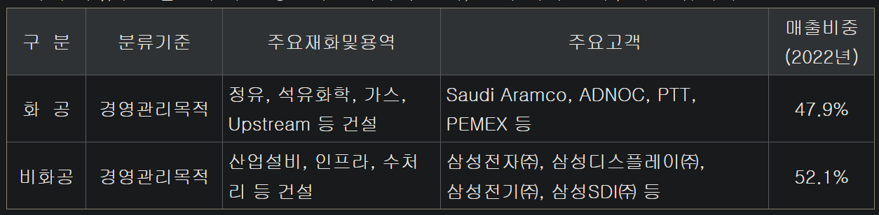 삼성엔지니어링은 플랜트기업이라 생각하면 쉬워요. 여기서 화공플랜트냐 비화공플랜트냐 나눌 뿐이죠. 비화공쪽은 삼성그룹과만 대부분 사업을 한다고 생각하면 됩니다.