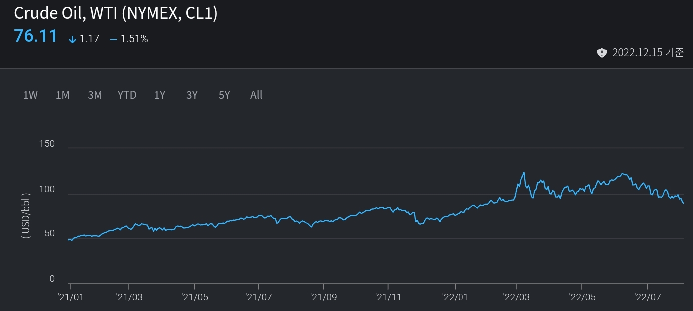 22년 초부터 러-우크라이나 전쟁과 각국 중앙은행들의 돈풀기로 인해 고인플레이션과 원유가격 상승을 경험했죠. 원유가격이 120$까지 돌파하면서 석유에서 파생된 기름값, 석유, 옷값 등 안오른게 없을 정도이죠. 당연히 삼성엔지니어링의 주가도 올랐습니다. 아래 차트는 WTI 원유가격추이고요 그 다음 차트는 삼성엔지니어링의 주가입니다. 원유WTI상승과 함께 삼성엔지니어링의 주가도 오른 것을 볼 수 있어요.