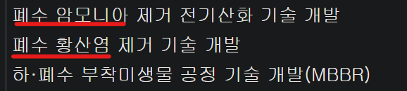 반도체에서 물을 많이 사용하기 때문에, 폐수가 많이 나오죠. 일반 물이 아닌 각종 가스들이 섞여나오는데요. 이것을 정화하는 수처리시설을 삼성엔지니어링이 합니다. 예를 들면, 아래 R&D에서 폐수 암모니아(NH3), 폐수 황산염(SOx) 등이 있죠. 삼성전자 반도체, 디스플레이 공장에 필수적으로 들어가는 수처리시설입니다.