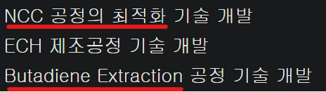 화공플랜트 관련 R&D부터 먼저볼게요. NCC공정의 최적화라고 나와있네요. 화공플랜트는 앞서 말했듯, 원유, 석유화학제품, 가스와 관련한 시설을 의미하는데요. NCC란 Naphtha Cracking Center의 뜻으로 석유화학업체들(LG화학, 롯데케미칼)이 나프타를 정제하여 여러 기초유분(에틸렌, 프로필렌, BTX) 등을 만듭니다. '석유화학업체 3분만에 이해'를 아직 안본 분들이라면, 꼭 보기를 추천드려요. 석유화학 더 이상 어렵지 않을 겁니다.
