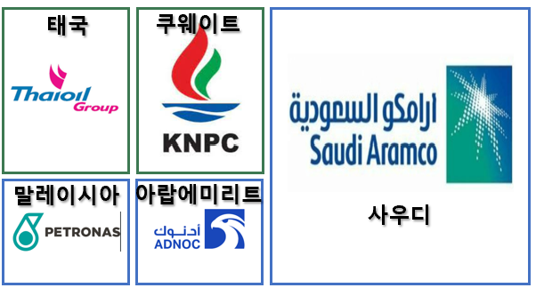 다만, 화공플랜트로 가면 아무래도 석유가 나는 나라에서 수요가 발생하겠죠. 흔히 알고 있는 기업들이 삼성엔지니어링의 고객사입니다. 대표적으로 사우디아라비아의 아람코가 있고요. 그리고 쿠웨이트 대표 국영기업 KNPC, 아랍에미리트의 ADNOC 등 굵직한 고객사들이 삼성엔지니어링에게 수주를 넣고 있습니다.