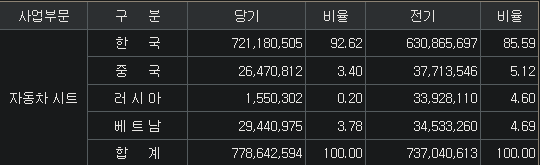 자동차시트(100%) / 거래처 : 기아 / 생산지역 : 국내 / 경쟁력 : 보유현금