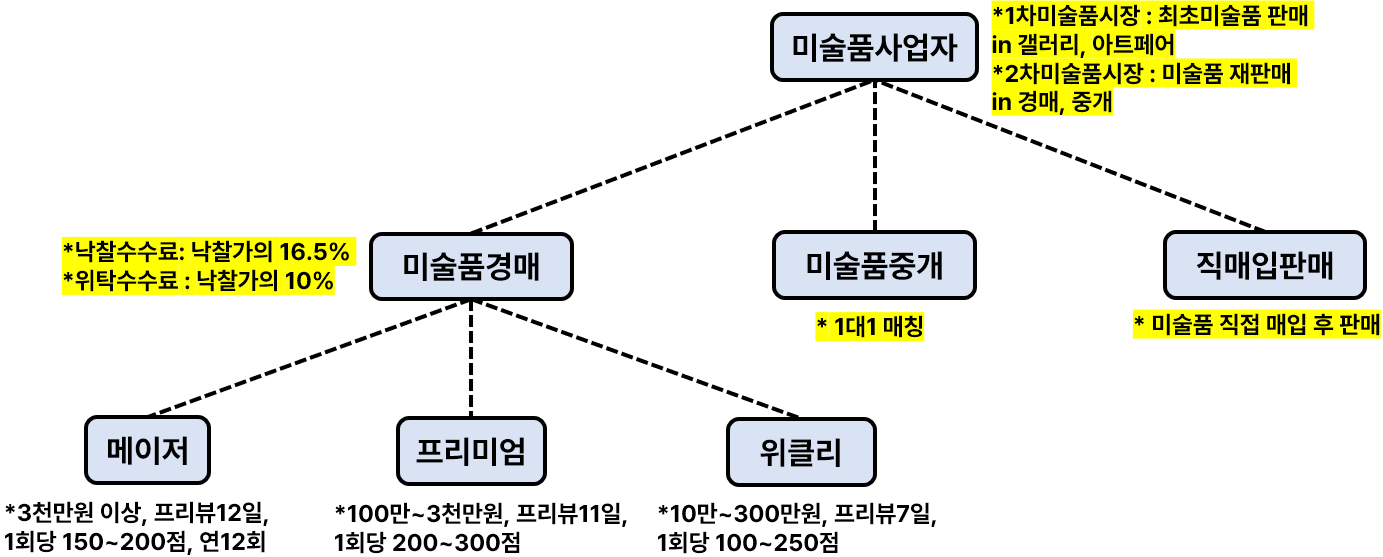 미술품유통 : 미술품경매(낙찰수수료, 위탁수수료), 미술품중개(1대1 연결), 직매입판매(직매입후 판매)