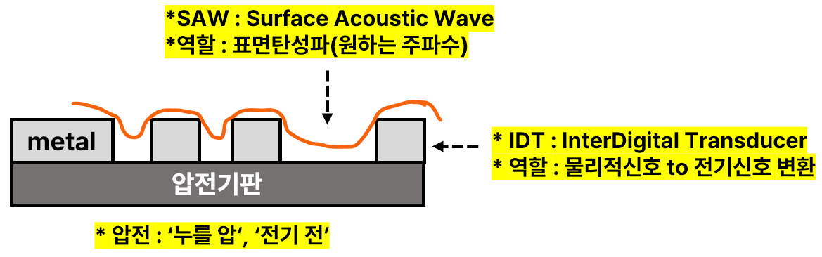 * IDT : InterDigital Transducer(물리적신호 to 전기신호 변환기) > 역할 : SAW 형성