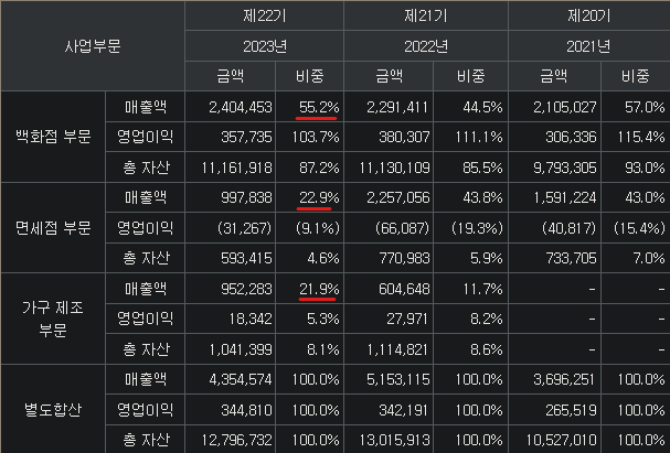 백화점(55%, 현대백화점, 더현대, 현대아울렛), 면세점(23%), 가구제조(22%, 지누스=매트리스, 서랍장 등) / 자회사 : 지누스(가구제조=매트리스, 서랍장 등)
